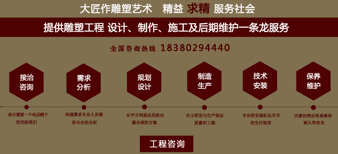 成都大匠作雕塑有限公司,是經(jīng)成都工商局審定注冊的正規(guī)專業(yè)雕塑制作及工程安裝服務機構(gòu),是由一群年輕富有朝氣的年輕人創(chuàng)辦,發(fā)軔于四川省成都市龍泉驛區(qū)。它是一家******于創(chuàng)作、制作和銷售為一體的公司。大匠作擁有多年從事公共藝術(shù)的專業(yè)人員和雕塑制作人組成的核心團隊,為您提供專業(yè)、具創(chuàng)新的設(shè)計及制作服務。公司成立以來,秉承“******服務、誠信為本”的宗旨,以客戶需求為目標導向,不斷學習,進取,優(yōu)化和提高服務質(zhì)量,公司向您******——“您的滿意***是我們的信譽”,我們將以飽滿的熱情和******的服務贏得您的贊譽和支持。